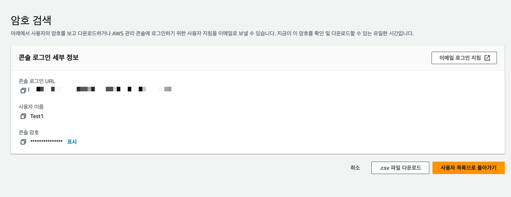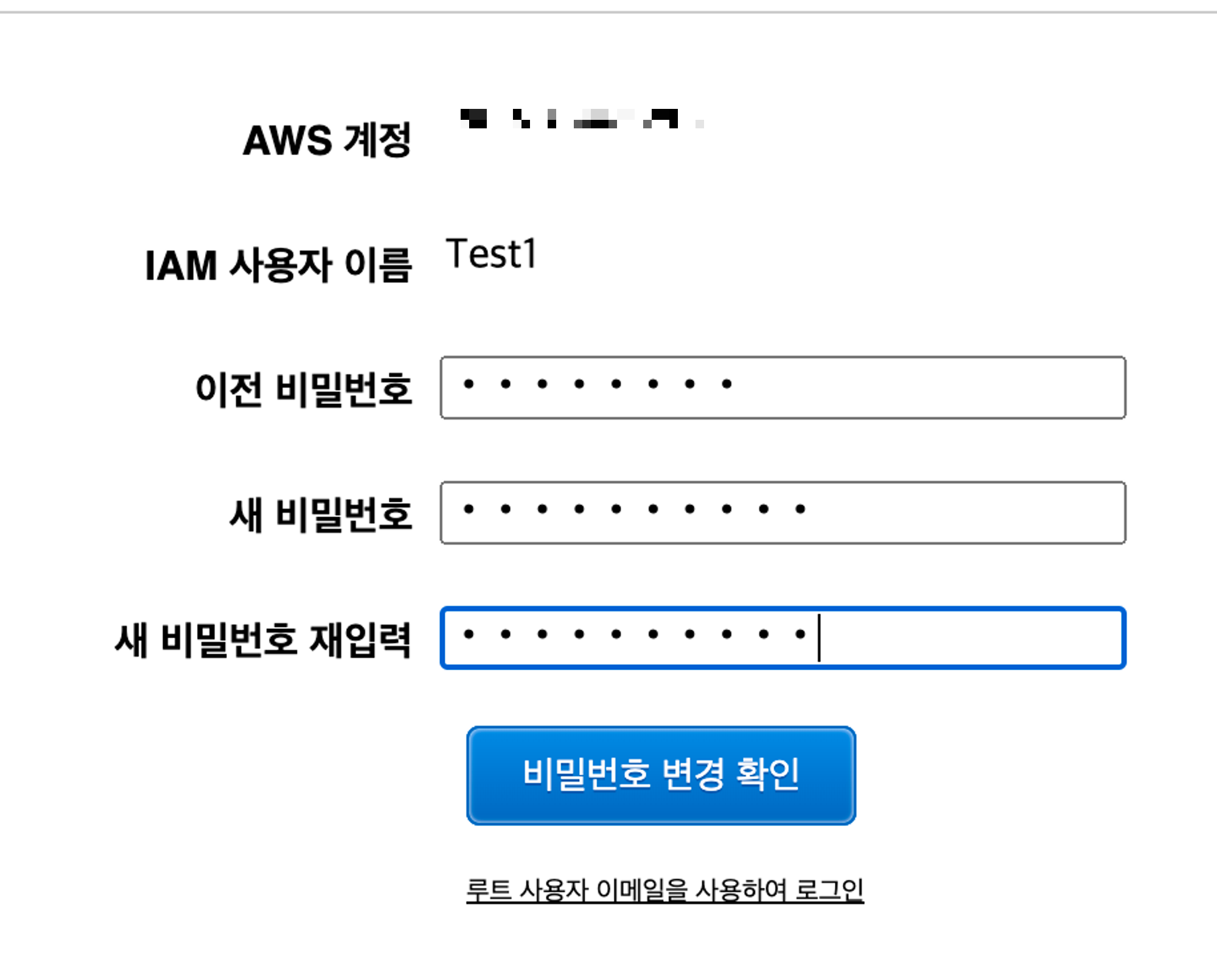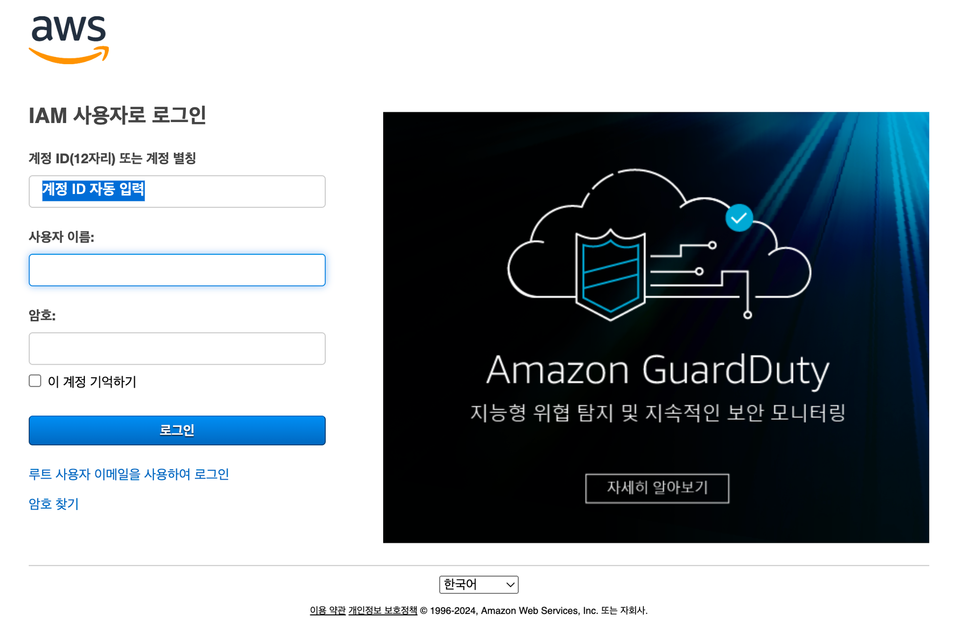 7. 콘솔 로그인 URL 확인하기: 위의 콘솔 로그인 URL에 들어가면 자동으로 계정 ID 12자리가 입력되어 있다.