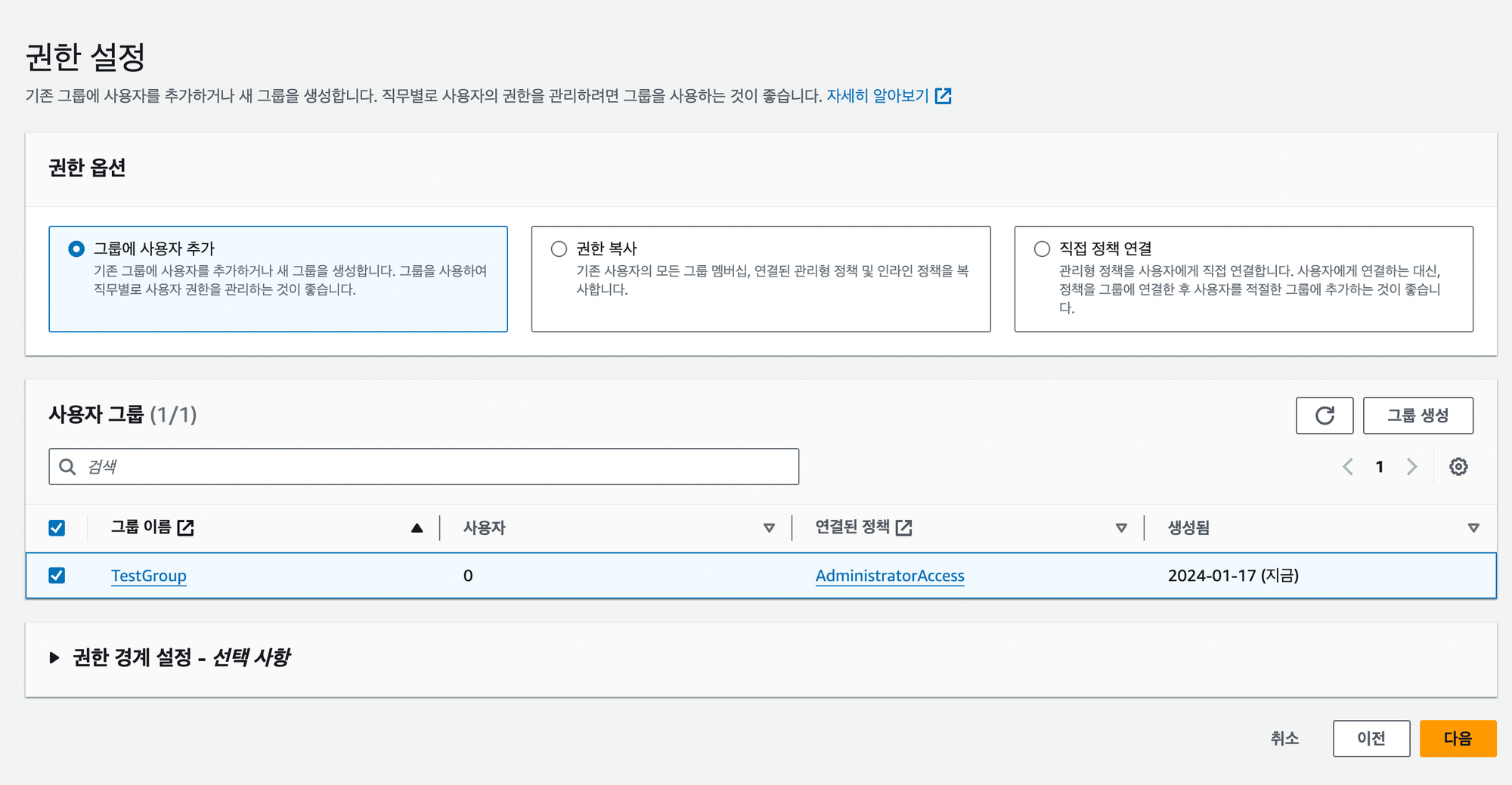 5. 권한 설정 > 사용자를 추가할 그룹 선택 > 다음 > 검토 후 생성