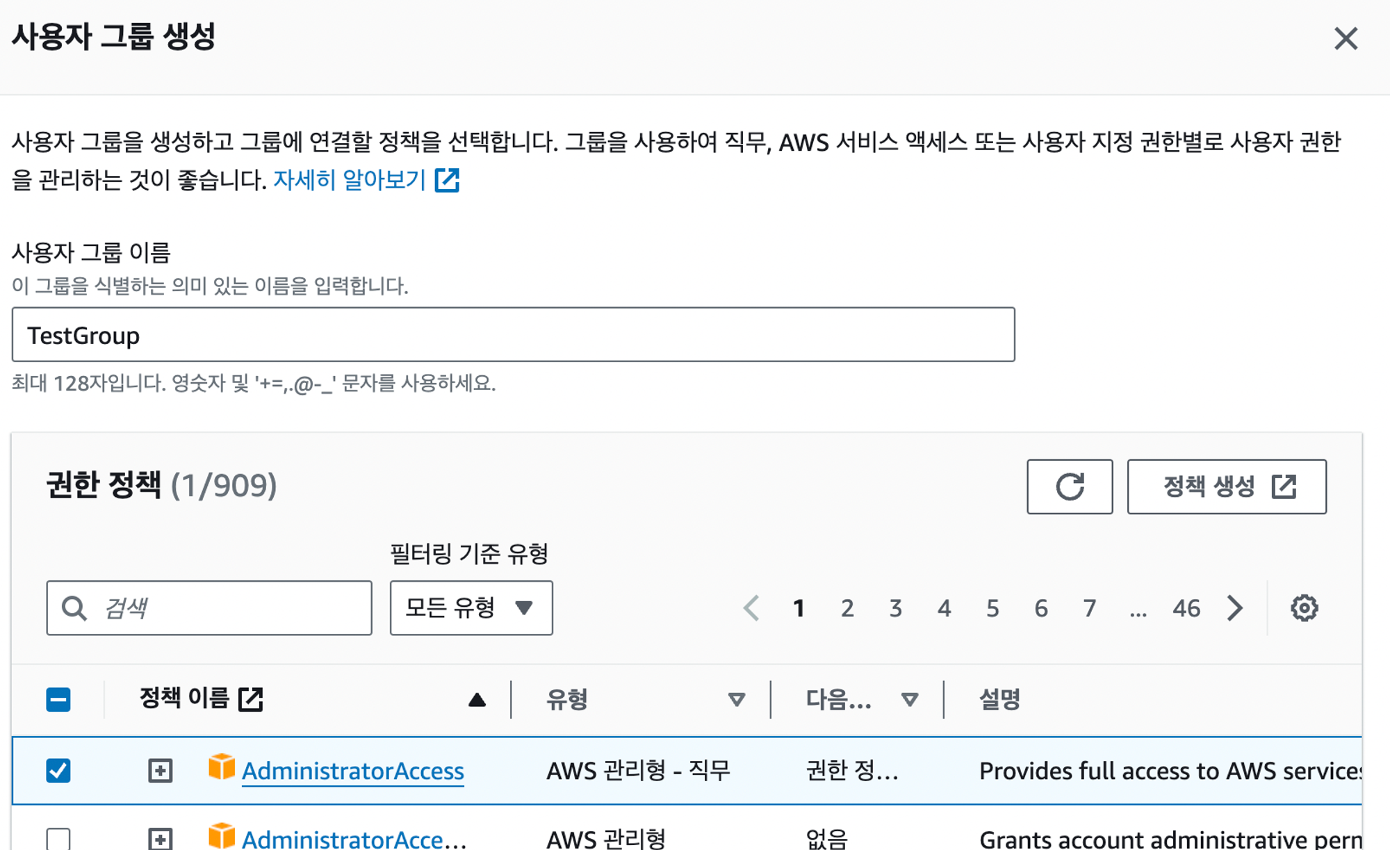 3. 권한 설정 > 그룹에 사용자 추가 > 그룹 생성 > 사용자 그룹 이름 지정 > 권한 정책 선택 > 사용자 그룹 생성