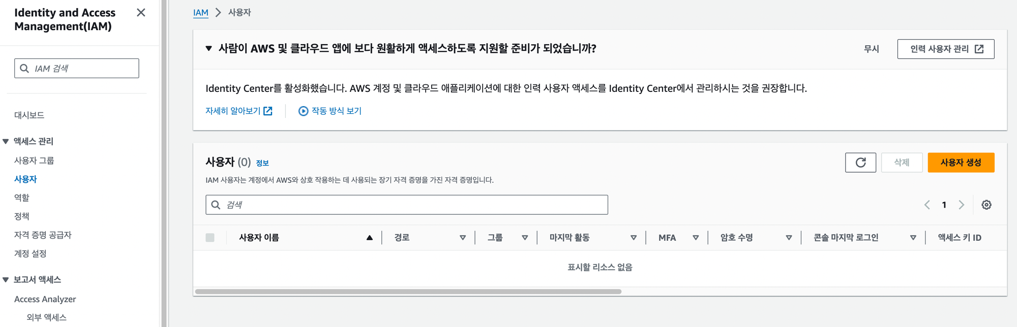 사용자를 생성할 때 IAM Identity Center에 권장 표시가 되어있는데 그 이유가 바로 여기에 있었음을 알게 되었다.