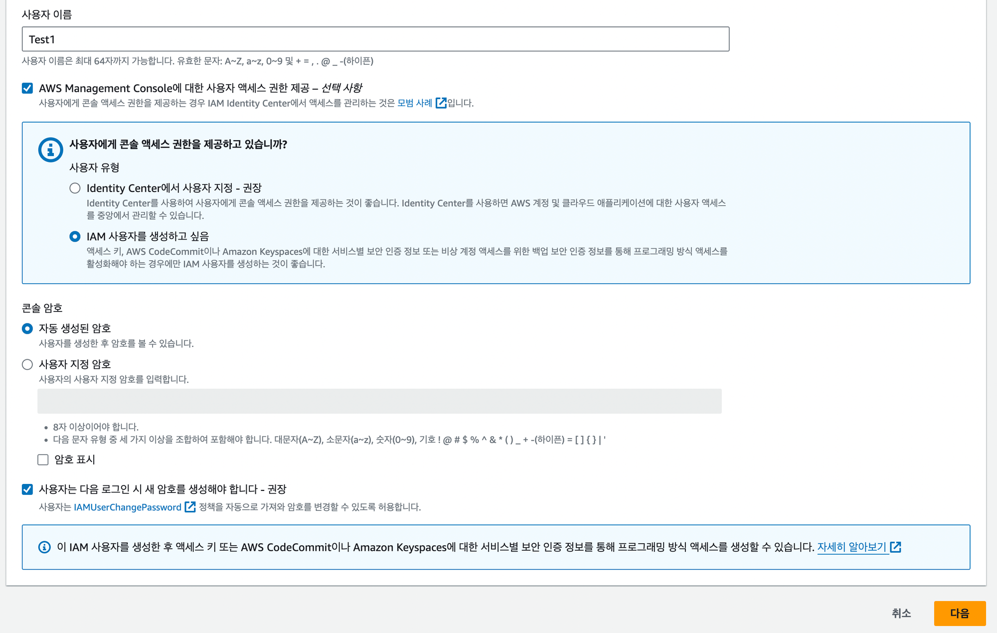 2. 사용자 세부 정보 지정 > 사용자 이름 지정 > AWS Management Console에 대한 사용자 액세스 권한 제공 > IAM 사용자를 생성하고 싶음 > 다음
